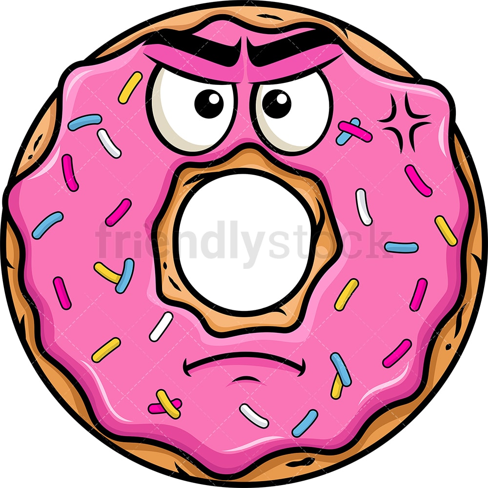 Royalty-free stock illustration of a donut emoji with strawberry frosting and sprinkles, looking angry.