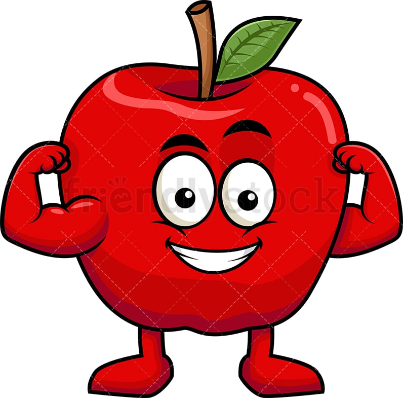 Royalty-free stock illustration of an apple cartoon character flexing its muscles, grinning, and looking strong.