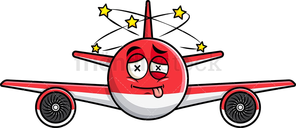 Royalty-free stock illustration of a knocked out or punched red, single engine airplane emoji, with its tongue sticking out, seeing stars from the hit it took.