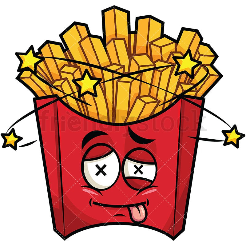 Royalty-free stock illustration of a knocked out or punched french-fried potatoes emoji (in a red pack), with its tongue sticking out, seeing stars from the hit it took.