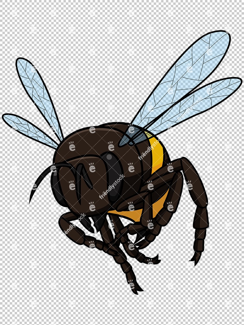 Royalty-free stock illustration of a realistic bee model as seen from the front while flying forward.