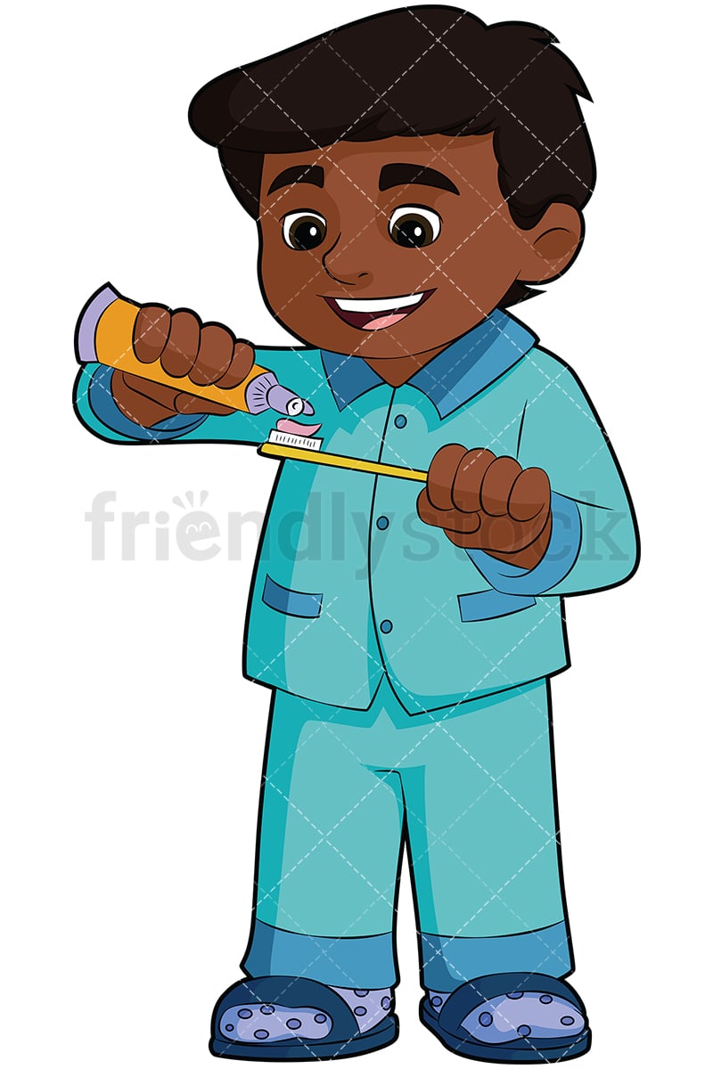 Royalty-free stock illustration of a black little boy in pajamas smiling as he applies toothpaste on his toothbrush.