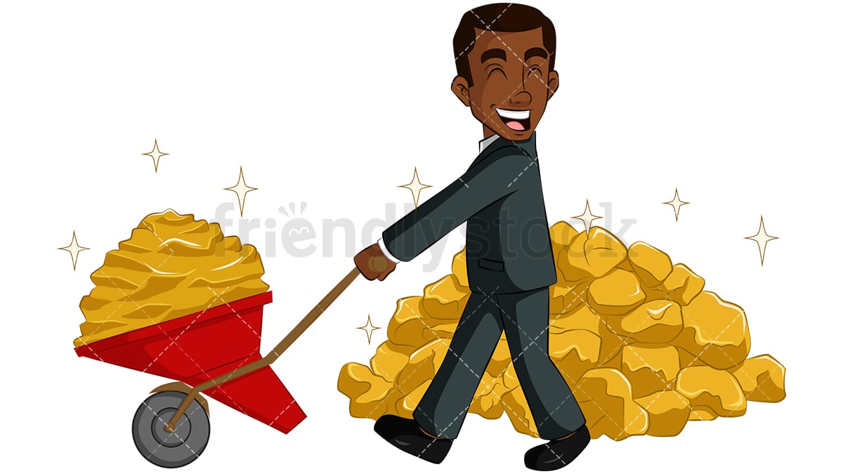 An Black Businessman Carrying His Gold In A Wheelbarrow Vector Cartoon Clipart