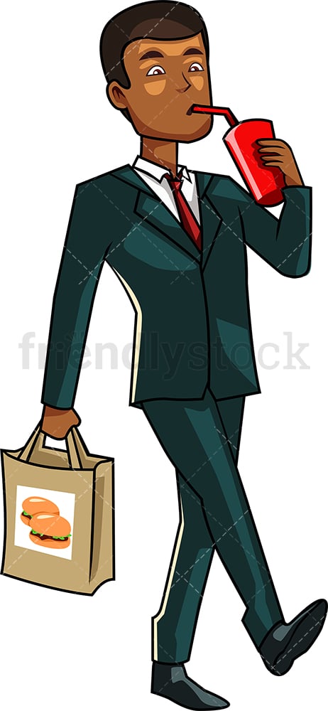 Royalty-free stock illustration of a black businessman carrying his lunch with a food truck in the background. His right hands carries a hamburger bag while he sips from the drink in his left hand. He’s so thirsty!