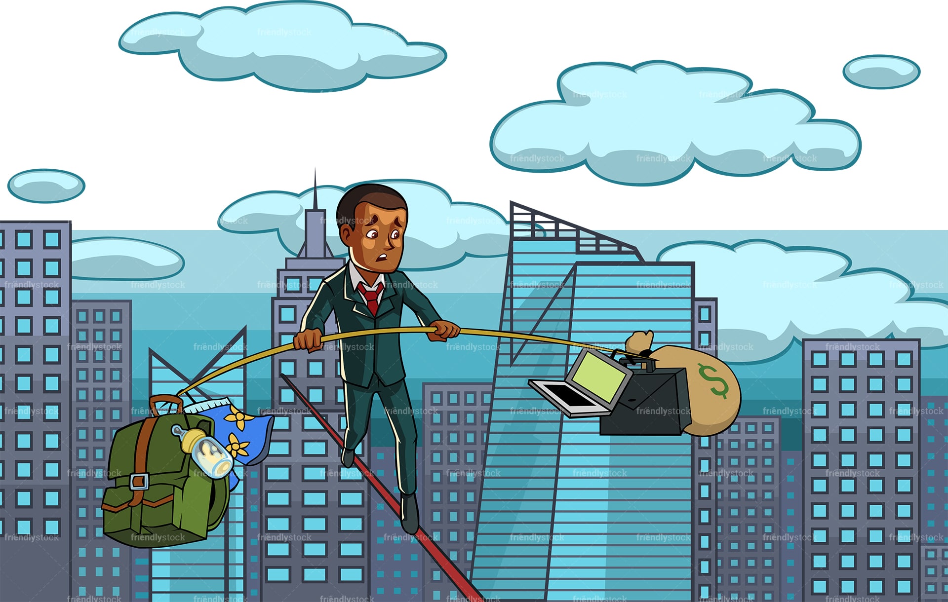 Royalty-free stock illustration of an anxious black businessman walking over a tied rope with a modern metropolis skyline in the background. Conceptual illustration of one’s struggle to balance career and family / personal life.