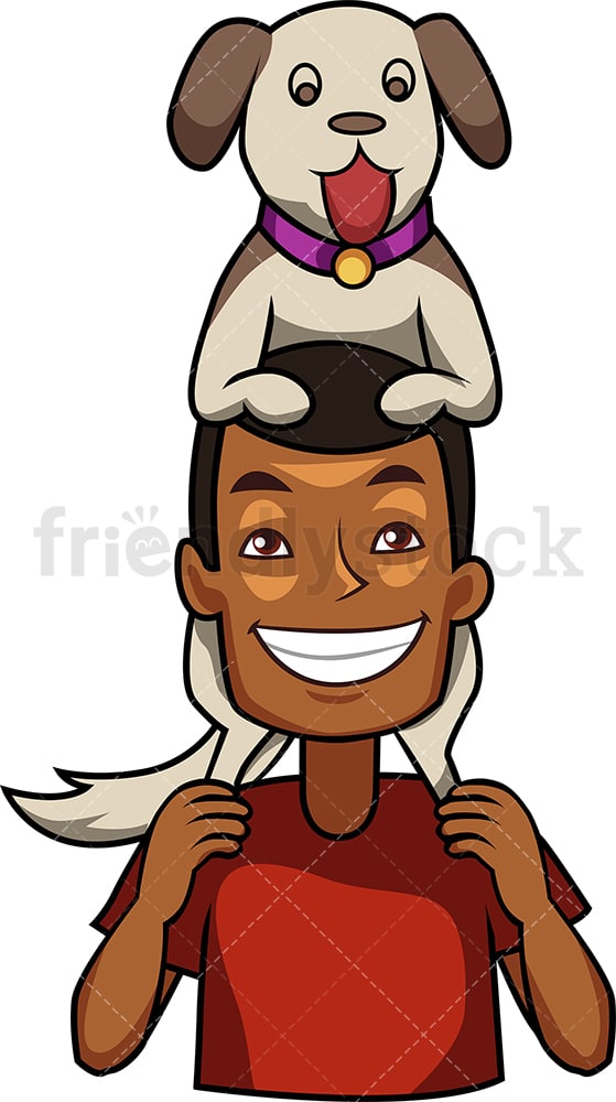 Royalty-free stock illustration of a joyous black man holding his puppy atop his shoulders. They both look excited to be together!