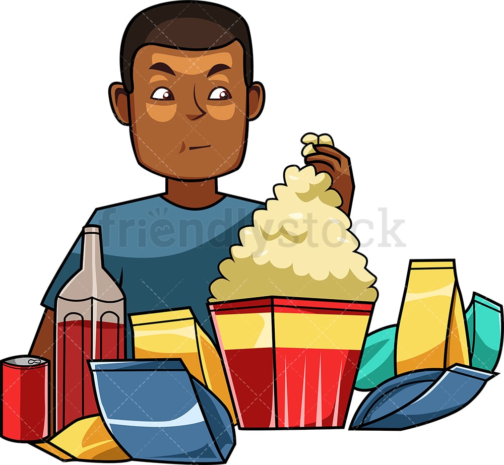 A Black Man Surrounded By Snacks And Sodas Vector Cartoon Clipart