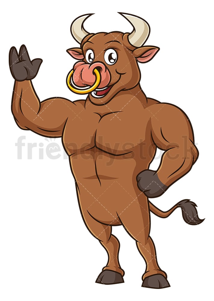 Royalty-free stock illustration of a muscular bull, standing up, and smiling as it waves.