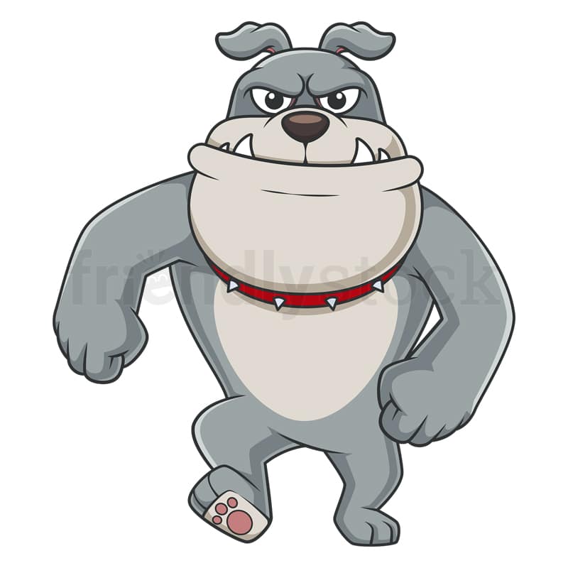 Royalty-free stock illustration of a gray bulldog mascot walking angrily towards us.
