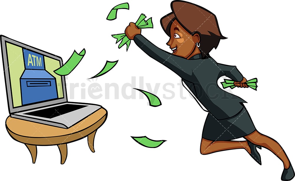 Royalty-free stock illustration of a successful black businesswoman trying to catch the cash piles that are overflowing from her virtual ATM machine. She loves online banking!