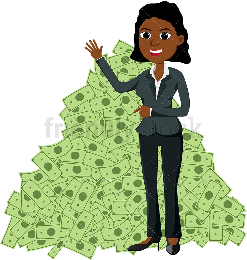 A Black Woman Pointing To A Massive Pile Of Dollar Bills Vector Cartoon Clipart