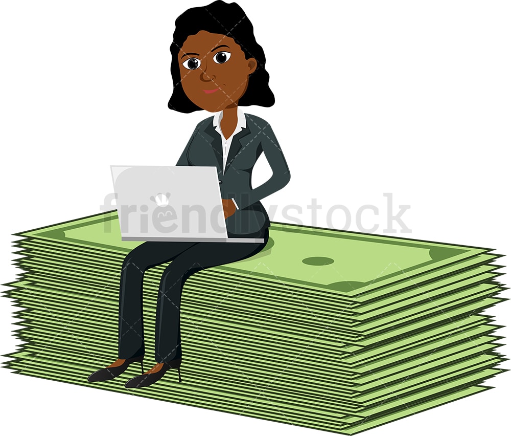 Royalty-free stock graphic of a black woman working away on her laptop while seated on top of an oversized bundle of dollar bills.