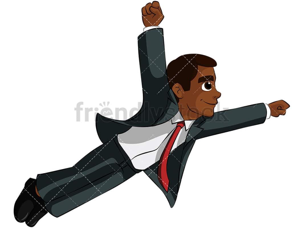 Royalty-free vector illustration of a black businessman flying like a superhero. Looks like he’s flying high in the air! What do you think he achieved?