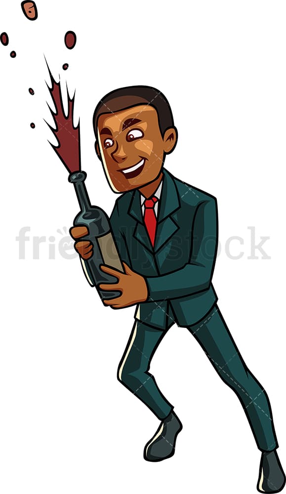 Royalty-free stock illustration of a black businessman holding a bottle of champagne as it flies in the air. He’s smiling and celebrating the big win!