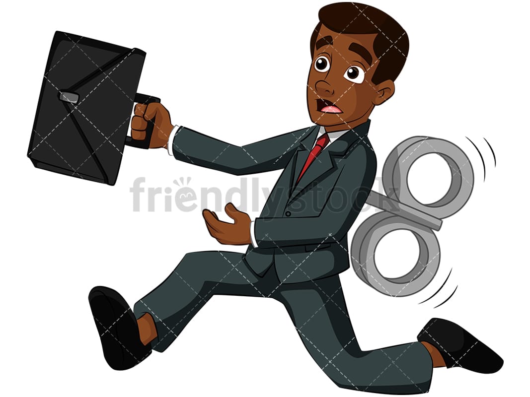 Royalty-free vector illustration of a black businessman posed as a windup toy, running and carrying his briefcase. He’s unable to control the momentum and is beginning to panic!