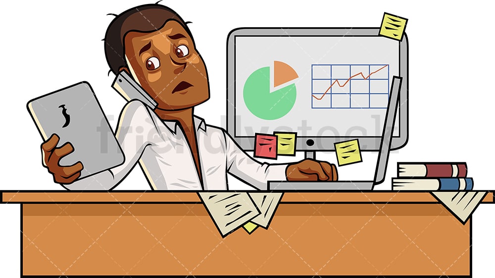 A Black Man Multitasking While Standing At His Workstation Vector Cartoon Clipart