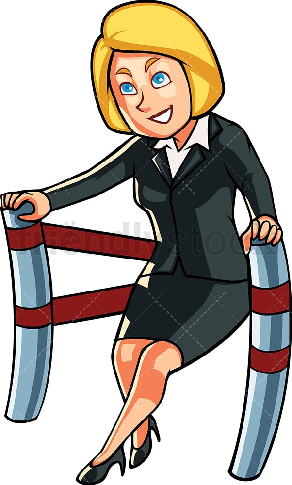 Royalty-free stock illustration of a businesswoman preparing to launch herself forward with a slingshot. She is smiling confidently and appears to be ready for success – right on her way to achieving true greatness! She has blonde hair and blue eyes and she’s formally dressed.
