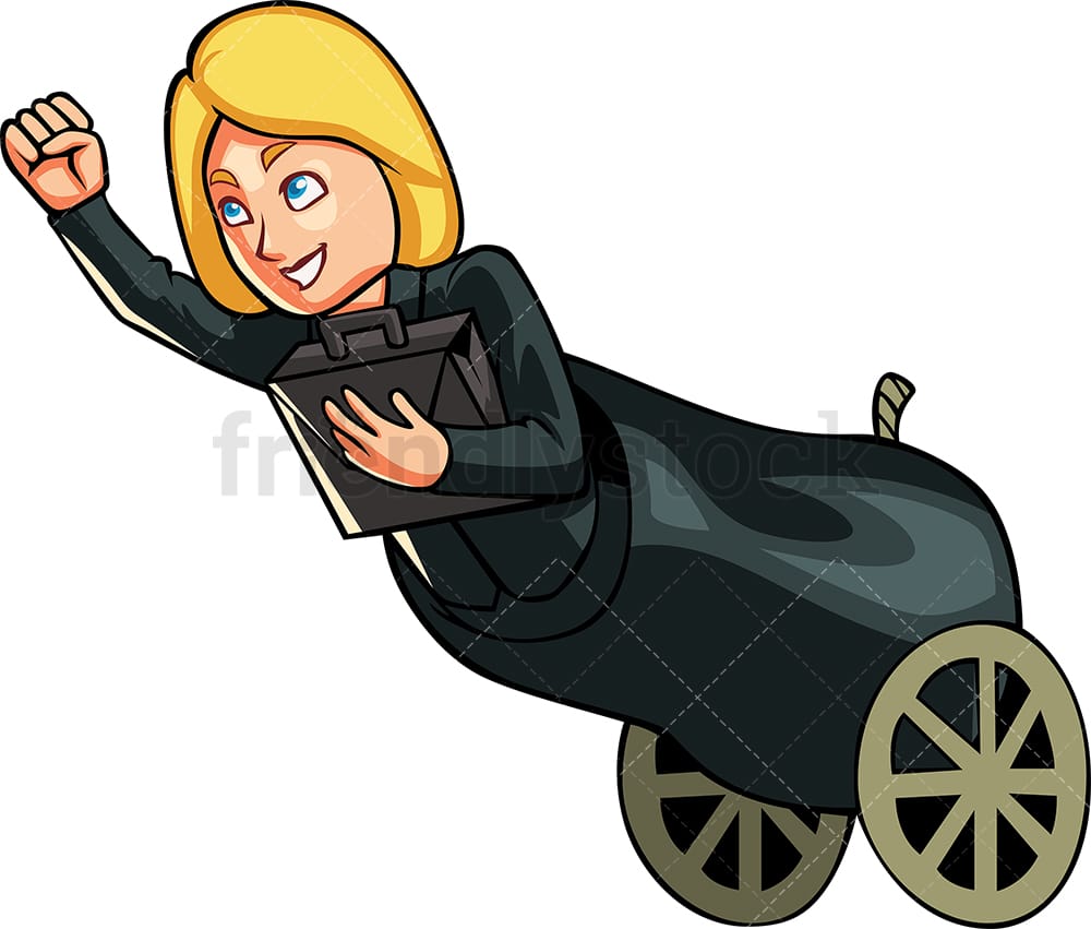 Royalty-free stock illustration of a businesswoman in a cannon about to fly into the sky. She’s holding her briefcase in one arm while the other arm raises a fist. She’s ready for take-off!
