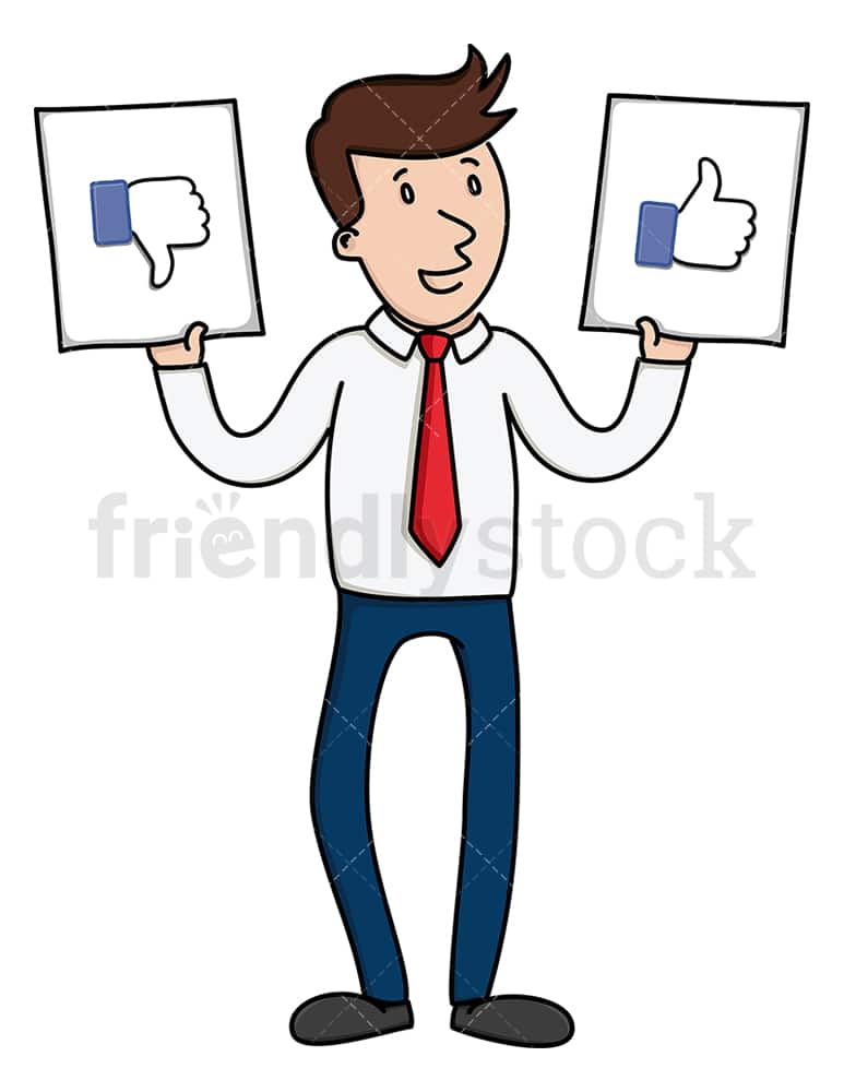 Royalty-free stock illustration of a content businessman holding a dislike sign with his one hand and a like sign with his other hand while smiling.