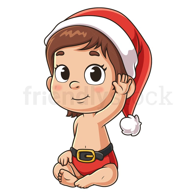 Royalty-free stock illustration of a baby girl dressed as Santa Claus, with Christmas hat and diaper, sitting down and smiling as she waves.