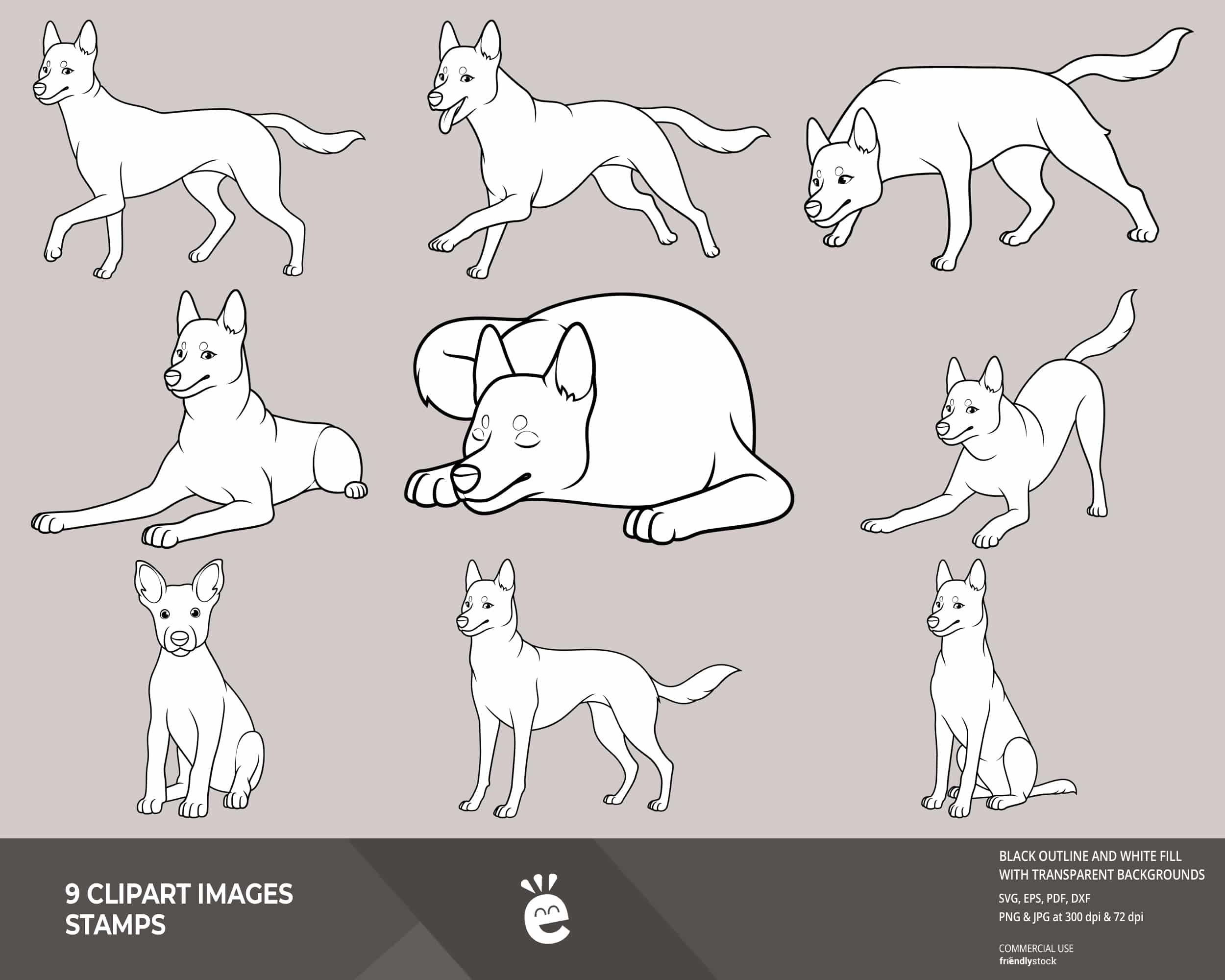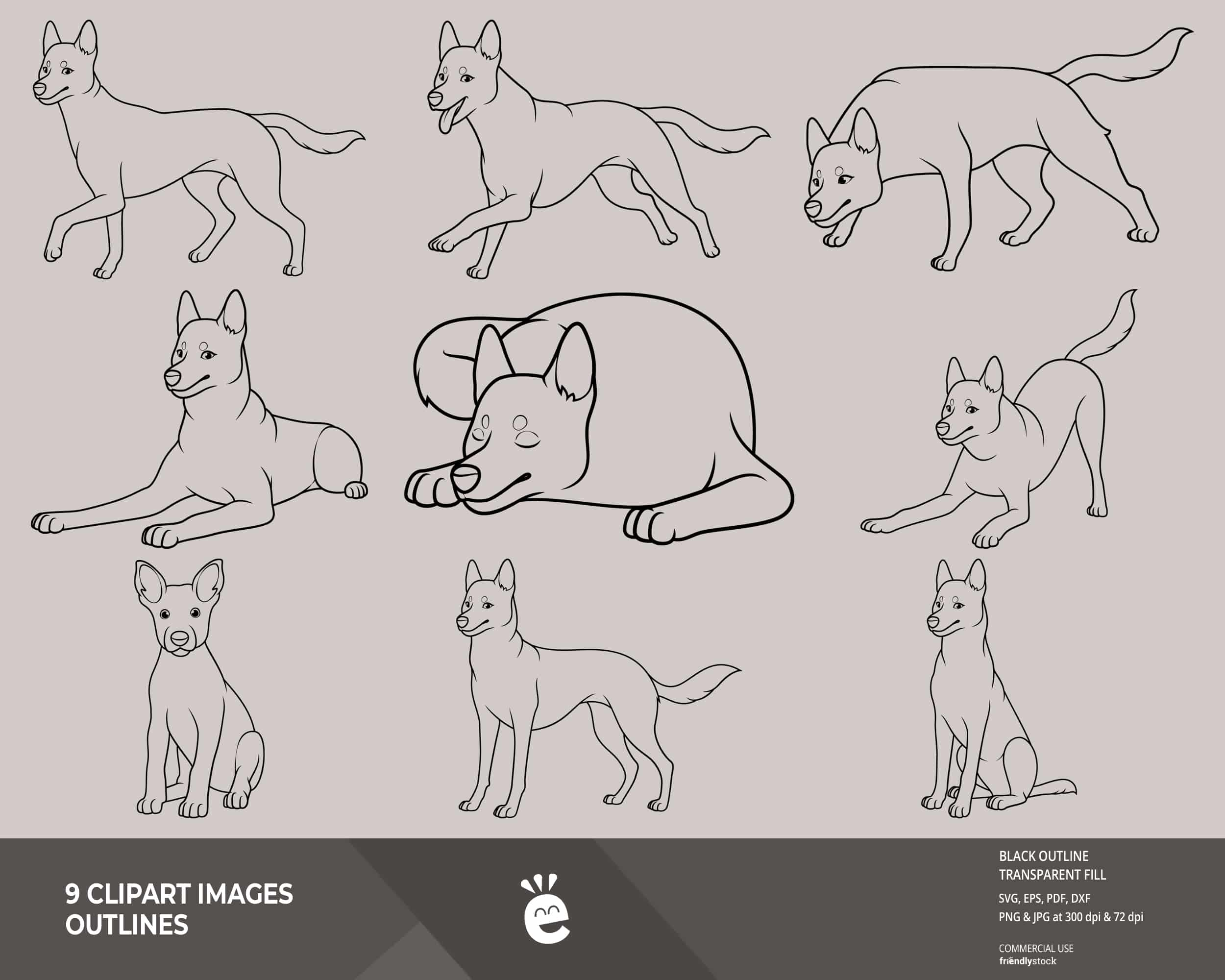 A collection of nine high-quality vector illustrations of various Belgian Shepherd dogs. The bundle includes the following cartoon clipart: