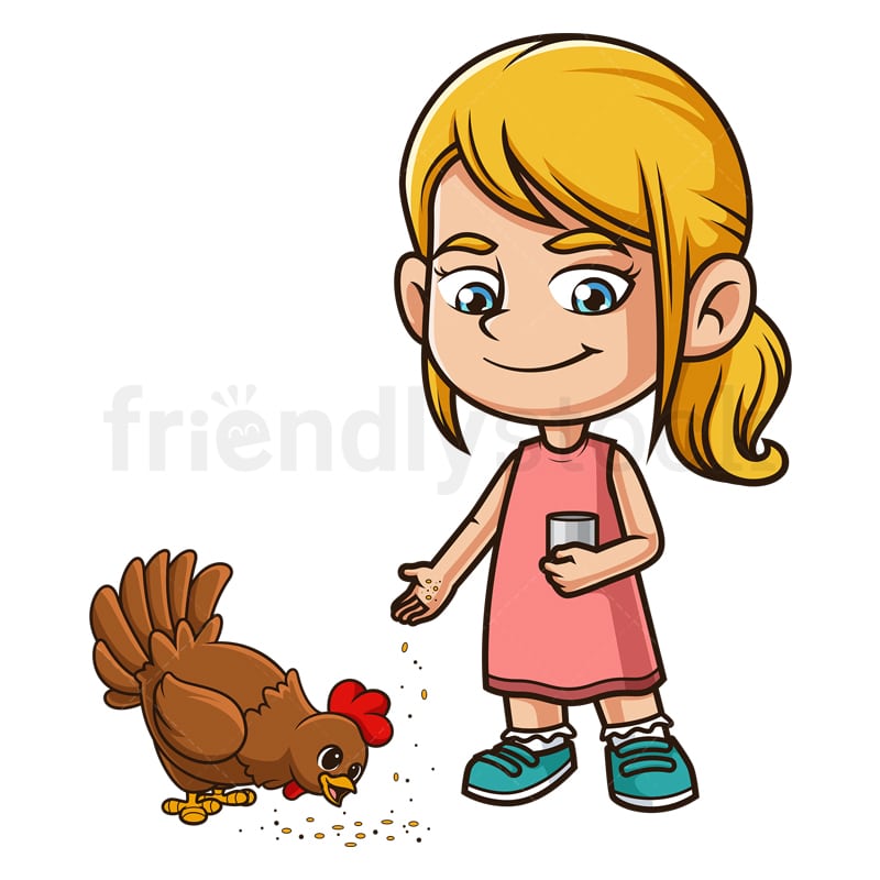 Royalty-free stock illustration of blonde little girl with blue eyes smiling as she feeds her pet het that is pecking.