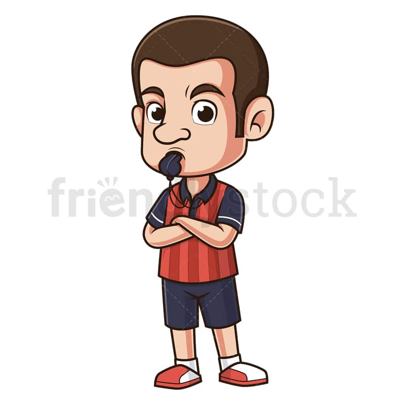 Royalty-free stock illustration of a small-sized football referee in uniform, with arms crossed over chest, and a whistle in his mouth.
