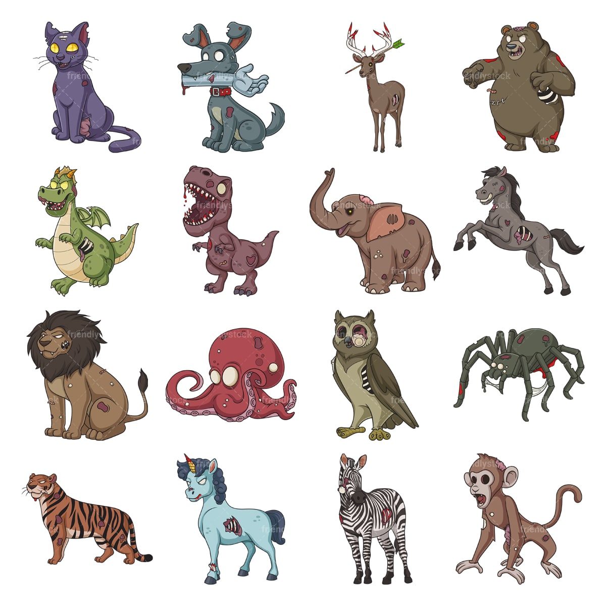 A collection of sixteen high-quality vector illustrations of various zombie animals. The bundle includes the following cartoon clipart: