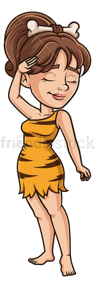 Royalty-free stock illustration of a cute cave woman wearing a bone clip in her brown hair and a dress, standing sideways and using her hand to block the sun from reaching her face.