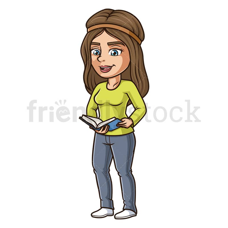 Royalty-free stock illustration of young woman with brown hair and blue eyes, smiling as she stands up, holding a book open with both hands.