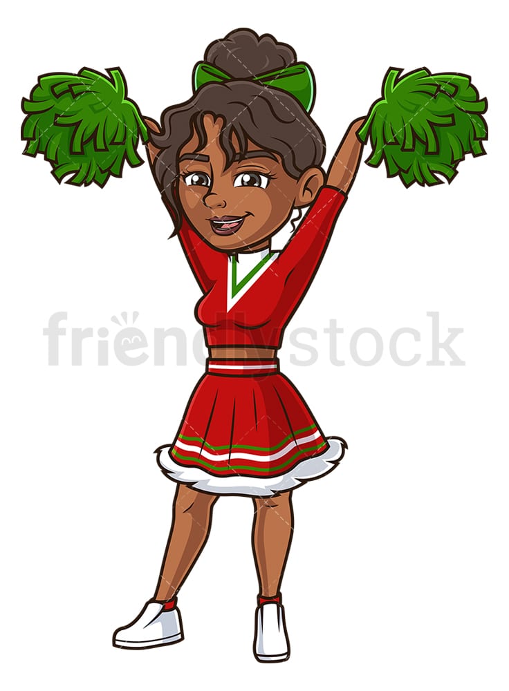 Royalty-free stock illustration of an African-American woman in a red Xmas cheerleading uniform, holding pom poms, and cheering.