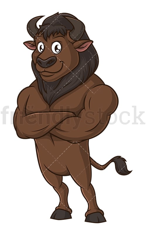 Royalty-free stock illustration of a bison standing up, with arms crossed over chest, looking content.