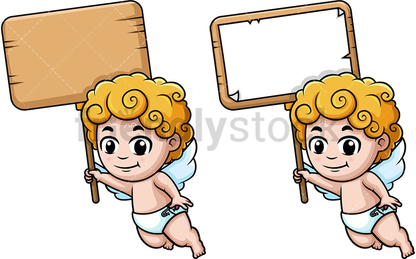 Royalty-free stock illustration of a cute looking cupid character with wings, holding a blank billboard sign. The download includes both images shown as separate files.