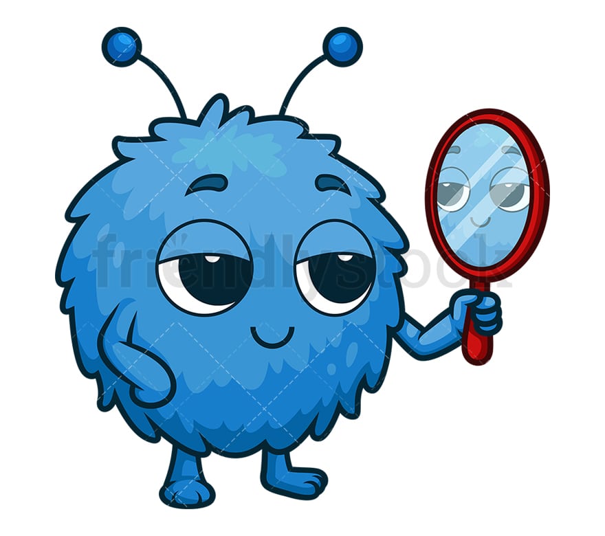 Royalty-free stock illustration of an adorable blue fluffy little monster demonstrating narcissism.