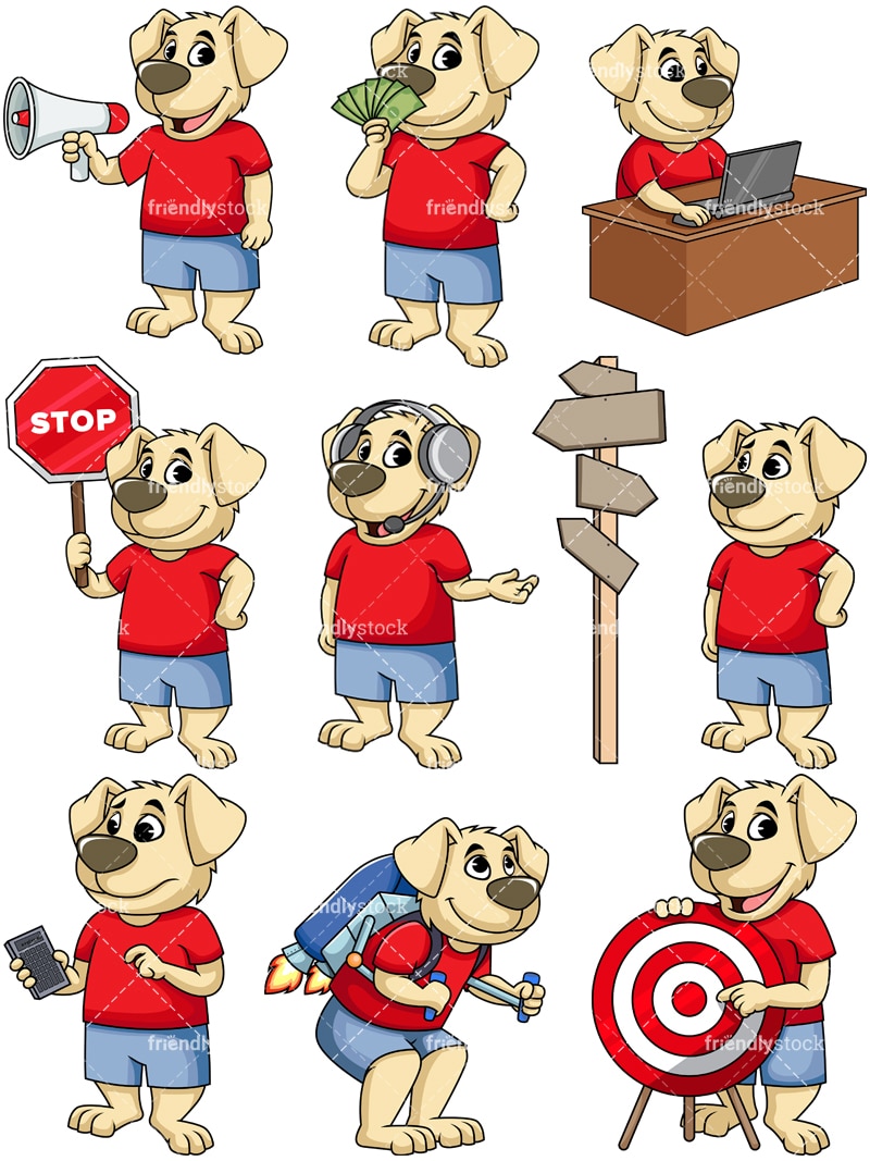 A collection of nine high-quality vector illustrations of mascot dogs in various poses. The bundle includes the following cartoon clipart: