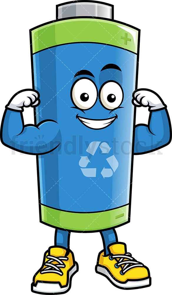 Royalty-free stock illustration of an eco-friendly battery with blue and green colors, flexing its muscles and looking strong.