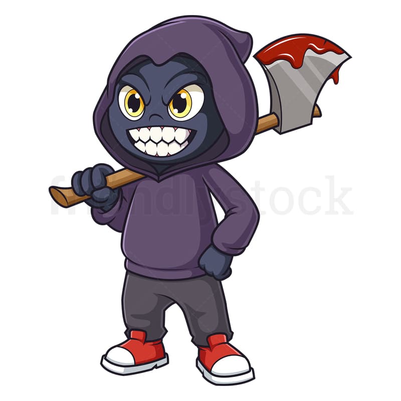 Royalty-free stock illustration of a small-sized evil humanoid with sharp teeth, wearing a purple hoodie and red sneakers, grinning as it holds an axe over its shoulder with blood on it.