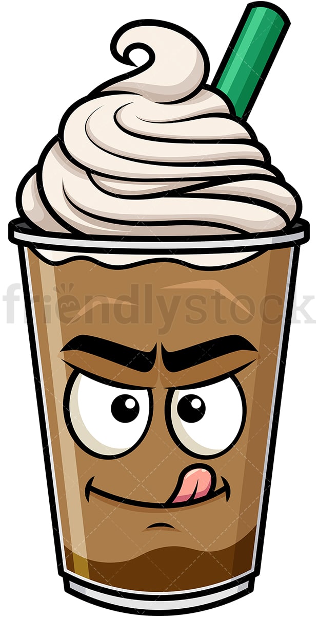Royalty-free stock illustration of an iced coffee emoji with a green plastic straw, licking its lips while wearing a malevolent look in its face.