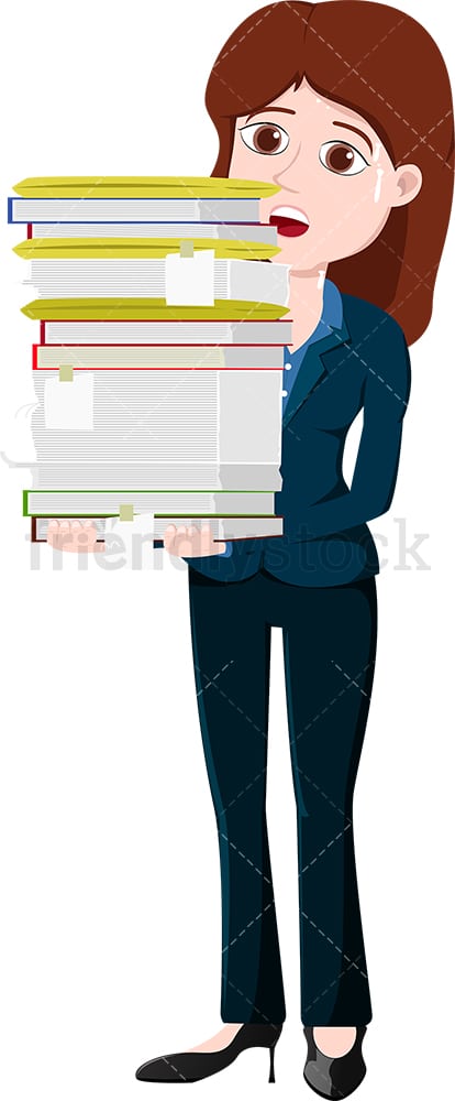 Royalty-free illustration of a woman carrying a massive load of paperwork, looking anxious and sweating a little bit.