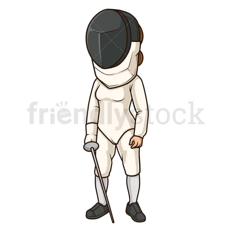Royalty-free stock illustration of a woman fencer wearing a lamé and a fencing mask, in full gear, holding her blade.
