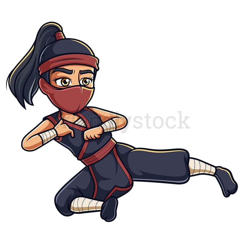 Female Ninja Flying Kick Vector Cartoon Clipart