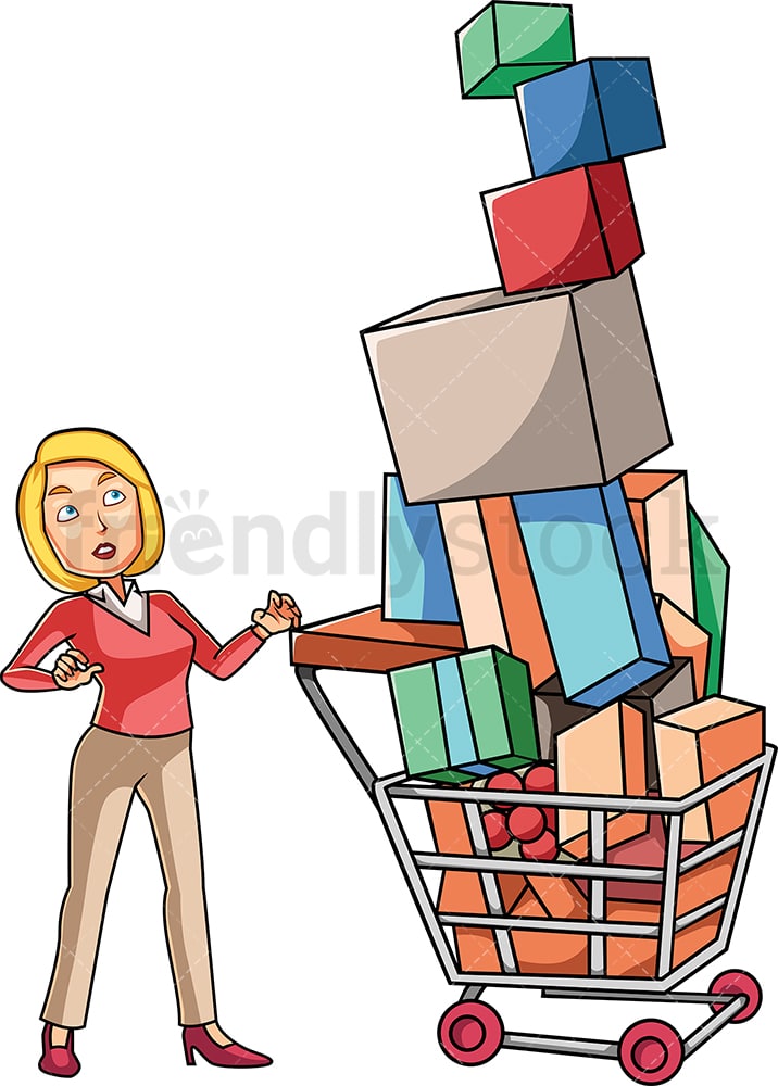 A Woman Looking At Her Overfull Cart With Guilt Vector Cartoon Clipart