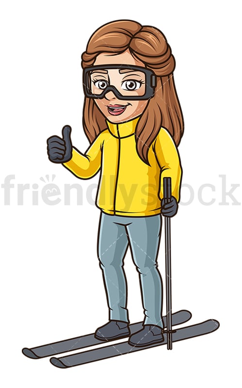 Royalty-free stock illustration of a young woman with long brown hair making a thumbs up gesture and smiling while skiing.