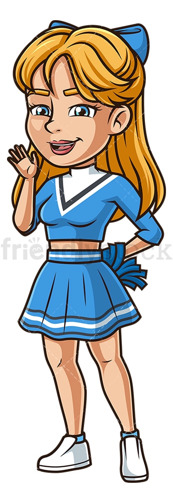 Royalty-free stock illustration of a caucasian woman in a blue cheerleading uniform, holding pom poms, standing up and waving, smiling.
