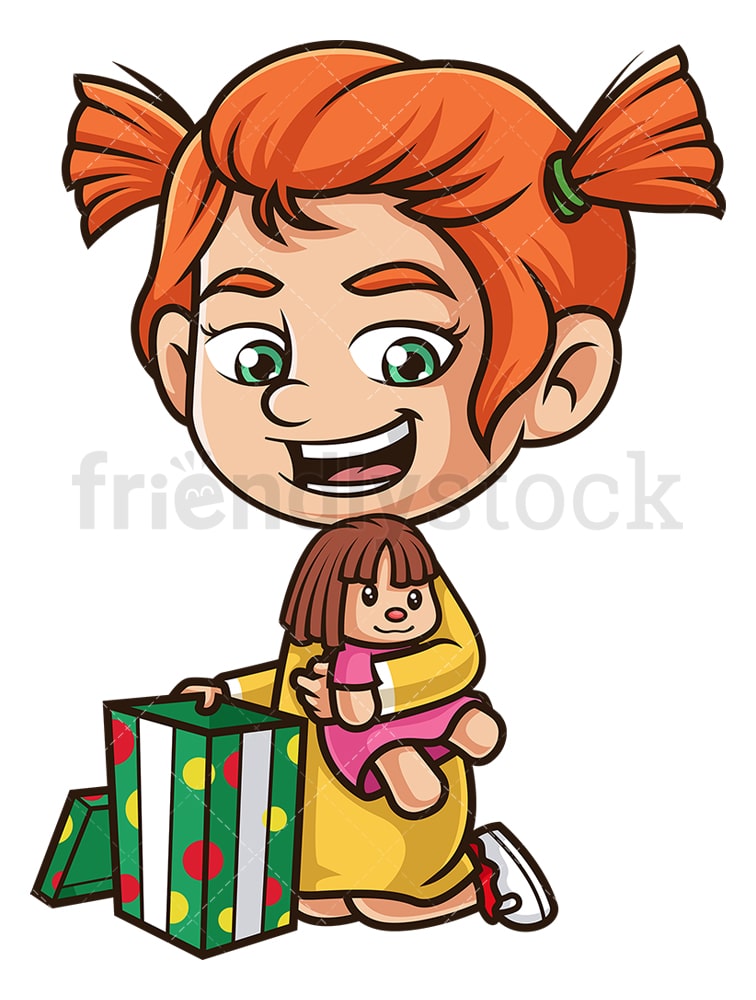 Royalty-free stock illustration of a ginger little girl with red hair and green eyes looking excited after opening a gift box to find a toy doll.