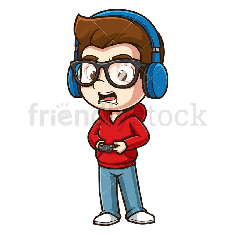 Royalty-free stock illustration of a man wearing glasses, headphones, and a hoodie, looking in the zone, as he holds a gaming pad while playing video games.