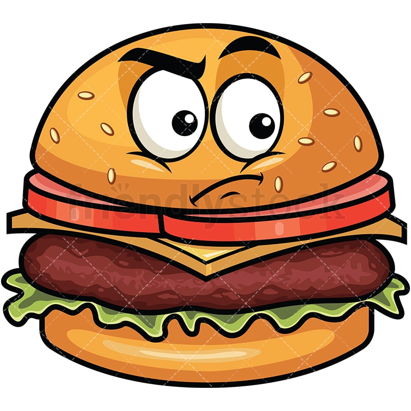 Royalty-free stock illustration of an annoyed burger emoji with meat patty, cheese, tomato, and lettuce, looking a bit angry and staring with suspicion.