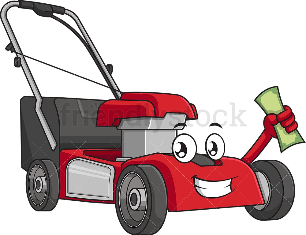 Royalty-free stock illustration of a red lawn mower holding a dollar bill with one hand, looking happy.