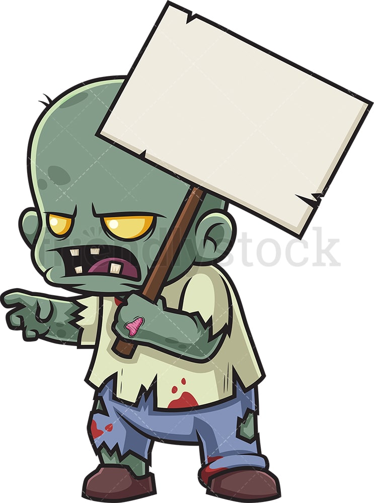 Royalty-free stock illustration of a male zombie kid looking angry and yelling while holding a blank billboard sign.