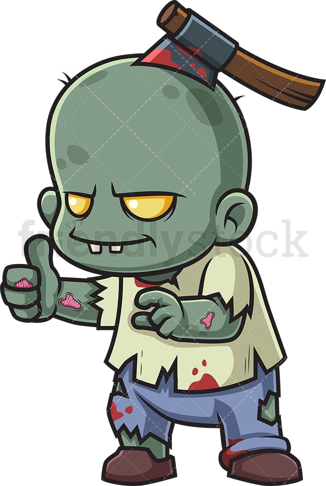 Royalty-free stock illustration of a male zombie kid with an axe in his head making a thumbs up gesture with one hand.
